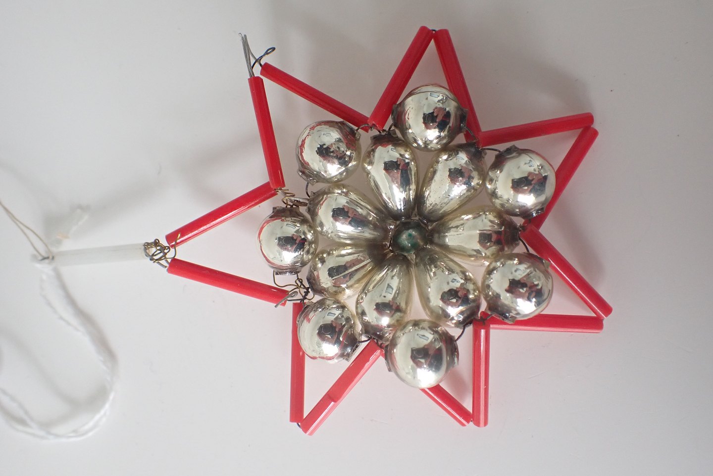 Nederst til venstre: Stjerne sammensat af glaskugler og glasrør. Ca. 1950. Pris: 95 kr.