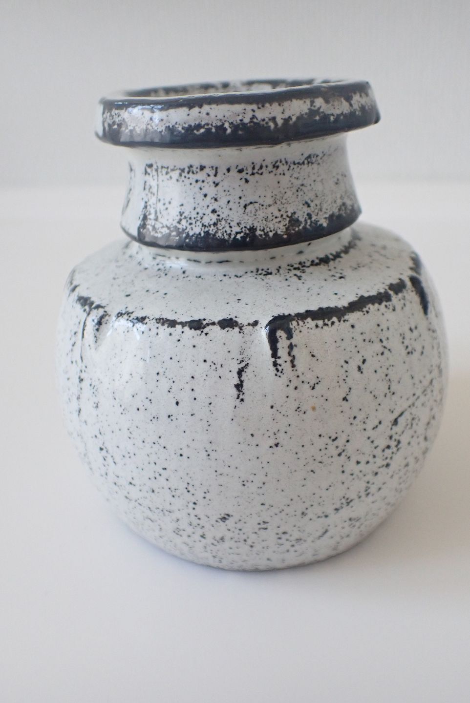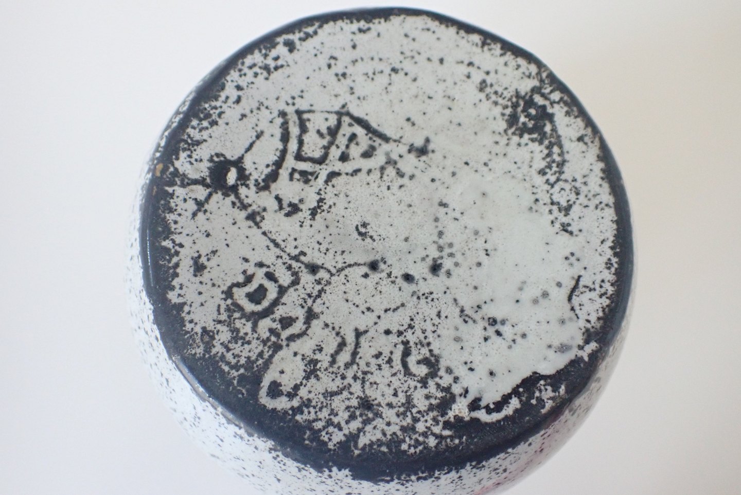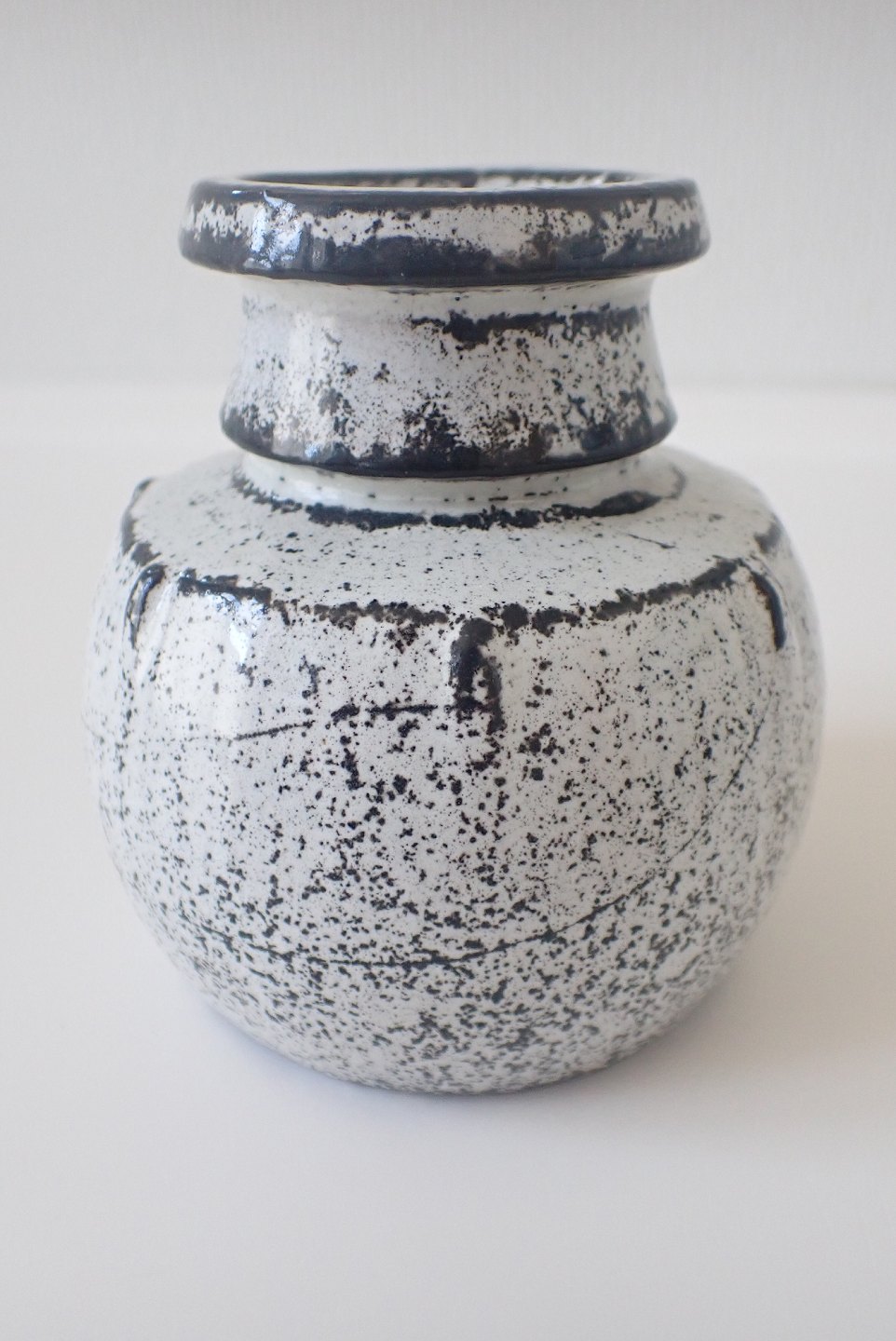 Svend Hammershøj (1873 - 1948) for Kähler. Buttet keramikvase i sort/hvid dobbeltglasur(askeglasur).Med smallere kantet hals og små dekorative "ører". Stemplet HAK, Denmark. Højde: 19,5 cm. I fin stand.