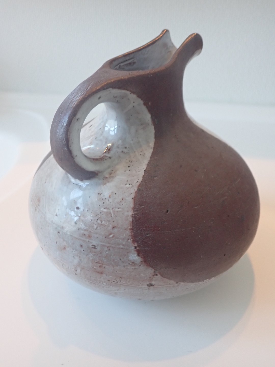 Gutte Eriksen (1918 - 2008) - spaltekande i hårdtbrændt ler med delvis, skulpturel glasering i lysegrå nuance. Ca. 1950. Højde: 14 cm. Bredeste bredde: 13,5 cm. I fin stand.