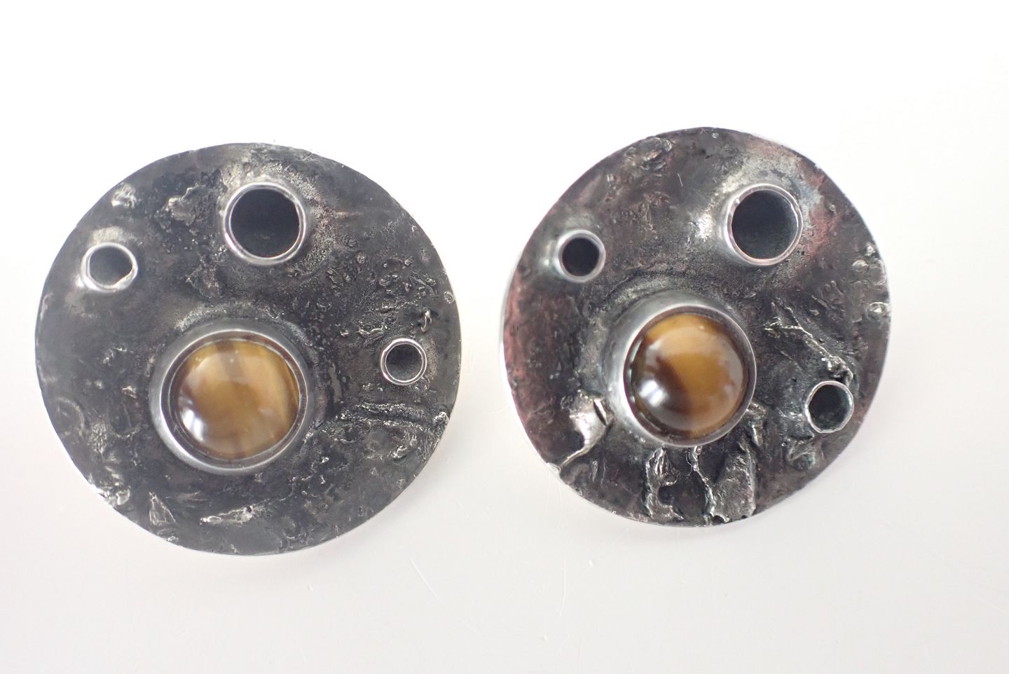Lysgård Design - Et par planet/måleformede øreklip i patineret sterling sølv med cabochonslebne tigerøje sten. Stemplet Lysgård design, sterling. #11.Ca. 1970. Samlet vægt: 12,4 gram. I fin stand.