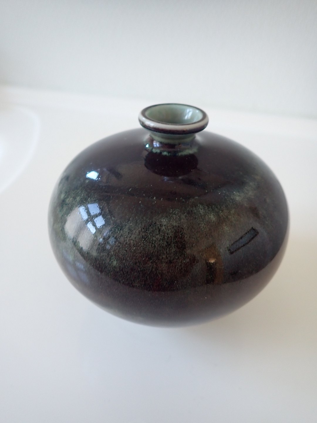 Berndt Friberg (1899 - 1981) - buttet vase i stentøj med lille krave med blank grøn/brun/sort spættet glasur. Stemplet Friberg, J (1968), Studio-hånd fra Gustavsberg. Højde: 10,7 cm. Bredde: ca. 10,5 cm. I fin stand.