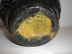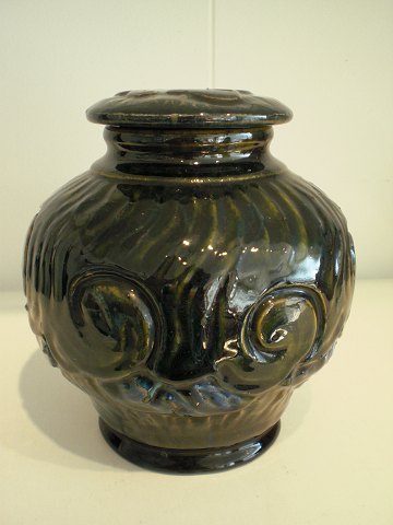 Lille lågvase i keramik med blå og brun glasur sgraffito med bløde bølger Stemplet MB 15 over H og 2 sammenslyngede initialer som jeg ikke kan læse. Møller og Bøgely 1917 - 1920 . Højde med låg: 14,5 cm - bredeste diameter: 12 cm. I fin stand med en oprindelig ujævnhed i bunden.