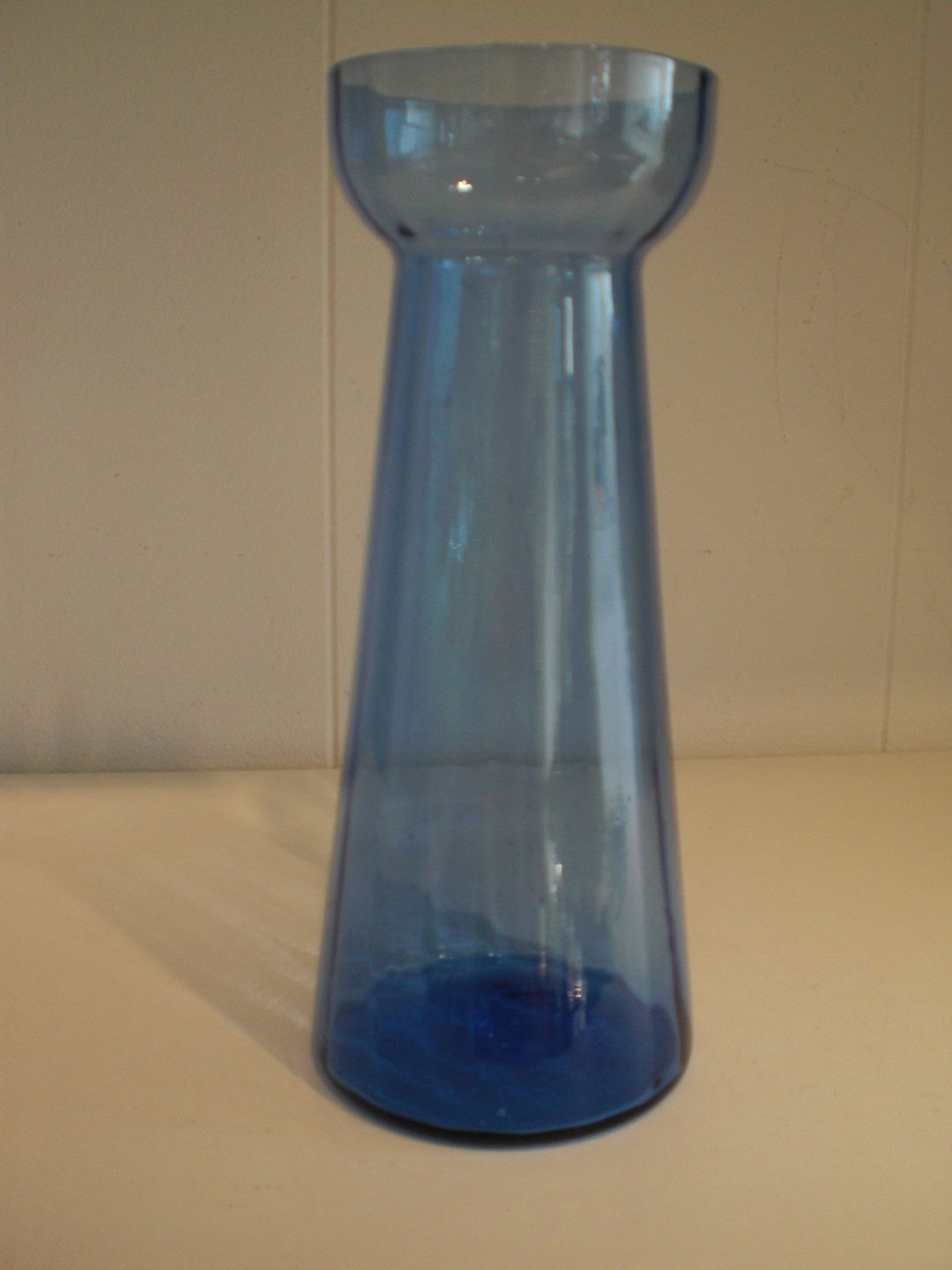 Søblåt hyacintglas/zwibelglas, lige optisk stribet. Dansk ca.1920. Højde: 21,5 cm. I fin fin stand.