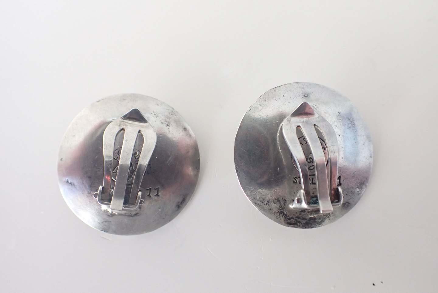 Lysgård Design - Et par planet/måleformede øreklip i patineret sterling sølv med cabochonslebne tigerøje sten. Stemplet Lysgård design, sterling. #11.Ca. 1970. Samlet vægt: 12,4 gram. I fin stand.